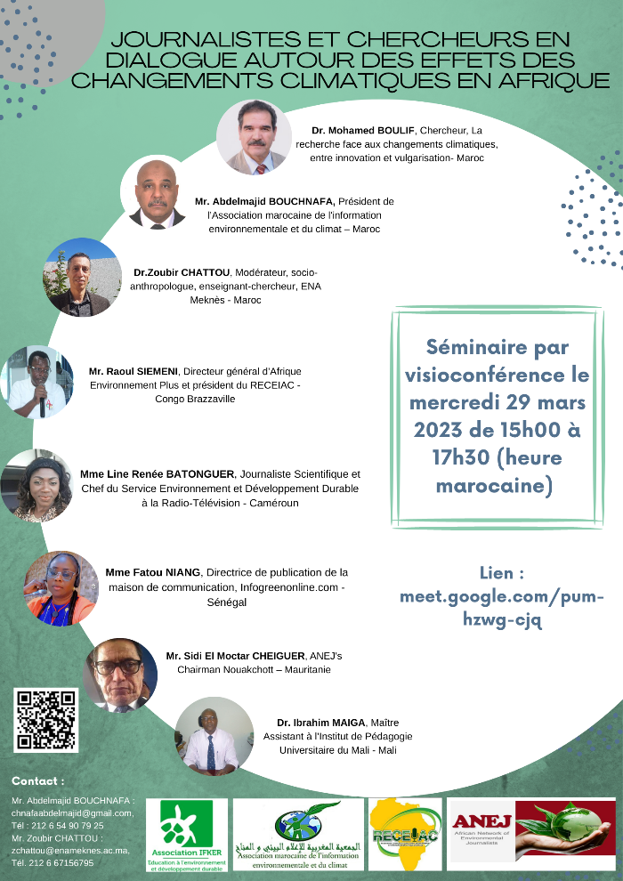 L’Association Marocaine de l’information environnementale et du Climat et l’Association Ifker d’éducation à l’environnement et développement durable, en coordination avec le Réseau des Journalistes Africains pour l’Environnement (ANEJ) et le Réseau des Communicateurs pour l’Environnement et information en Afrique Centrale (RECEAC), ont organisé Webinaire le 29 mars  2023 sur le thème « Journalistes et Chercheurs en Dialogue sur l’impact des changements climatiques en Afrique ».