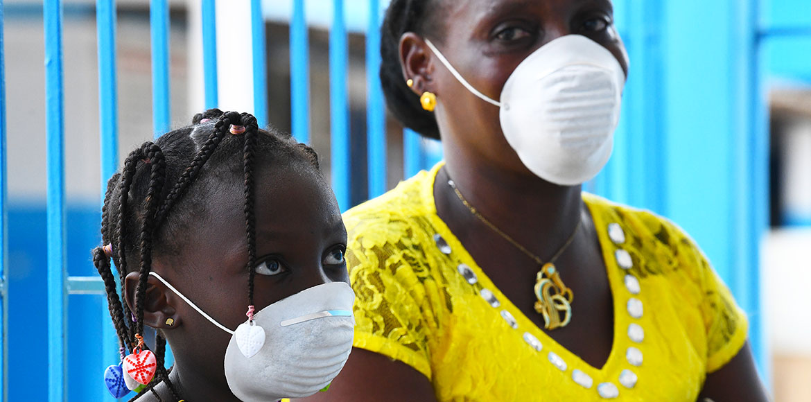 Une mère et sa fille portent un masque pour se protéger contre le coronavirus dans un centre de santé à Abidjan, en Côte d’Ivoire.