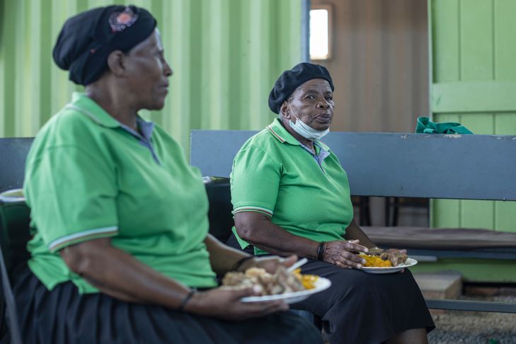 Dlomo Nomaqhawe, 39 ans, engloutit son assiette. La pandémie de Covid-19 en Afrique du Sud lui a coûté son travail et, coup du sort, un incendie a ensuite réduit sa maison en cendres.